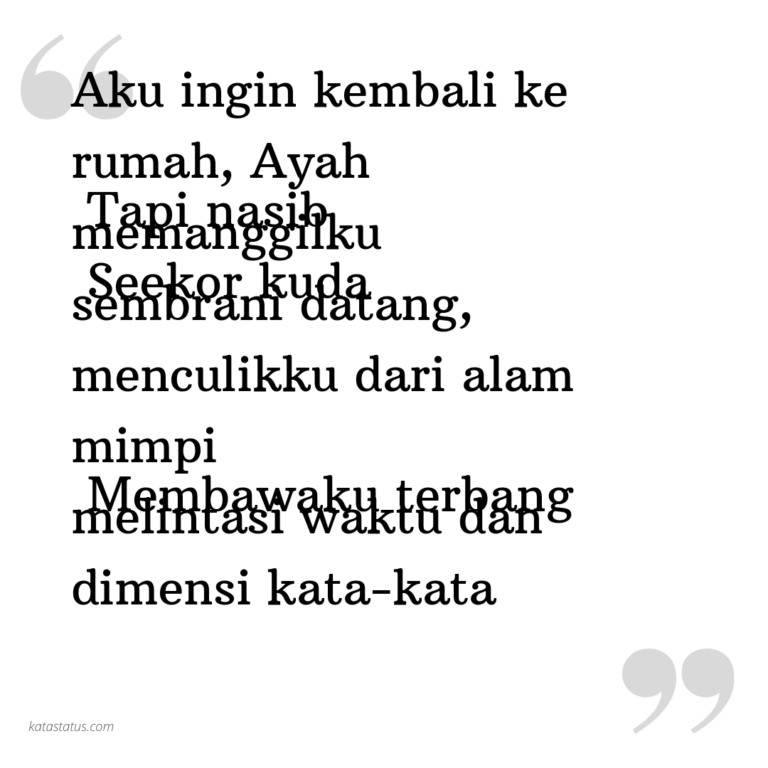 Pramoedya Ananta ToerAku ingin kembali ke rumah, Ayah Tapi nasib memanggilku Seekor kuda sembrani datang, menculikku dari alam mimpi Membawaku terbang melintasi waktu dan dimensi kata-kata