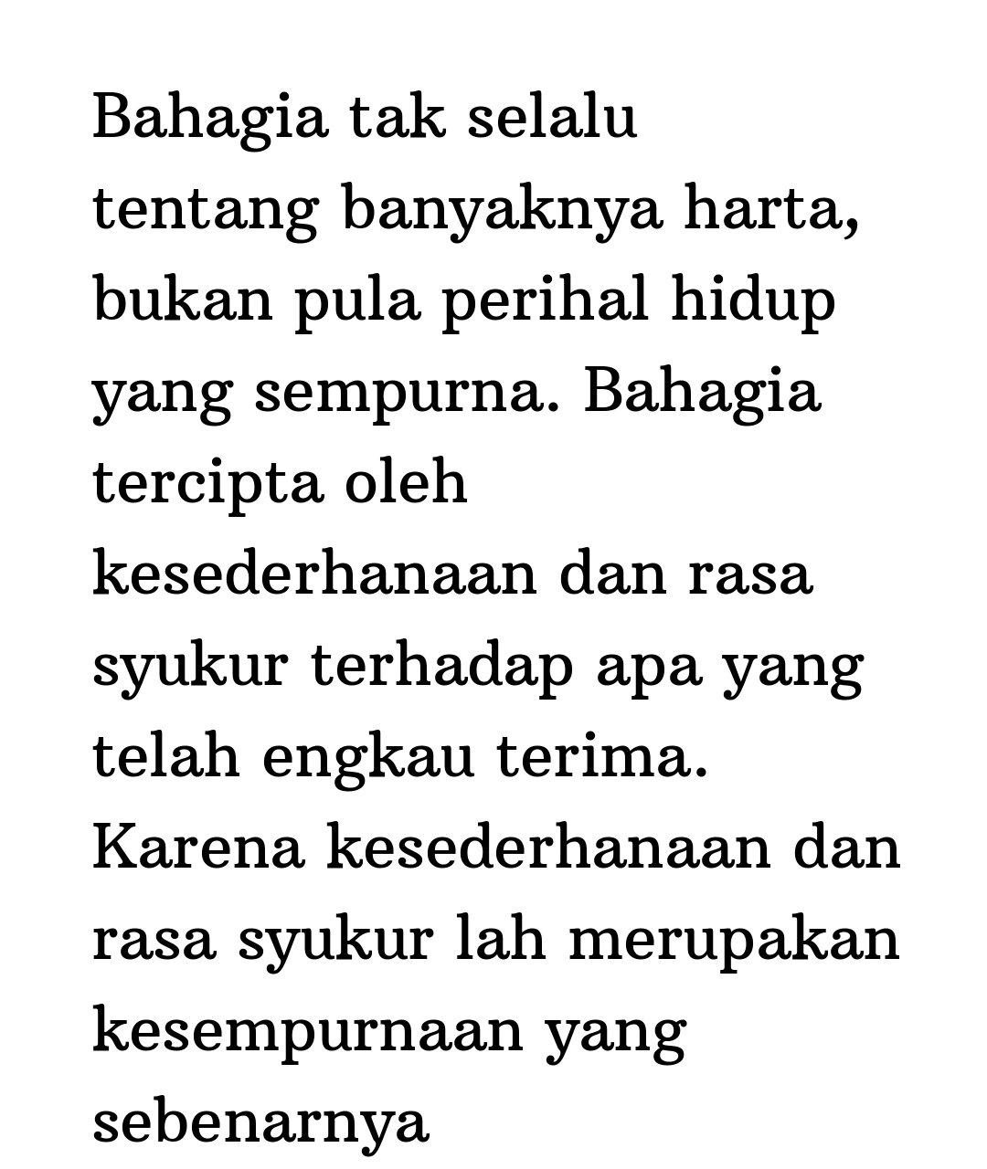 Bahagia tak selalu tentang banyaknya harta, bukan pula perihal hidup yang sempurna. Bahagia tercipta oleh kesederhanaan dan rasa syukur terhadap apa yang telah engkau terima. Karena kesederhanaan dan rasa syukur lah merupakan kesempurnaan yang sebenarnya