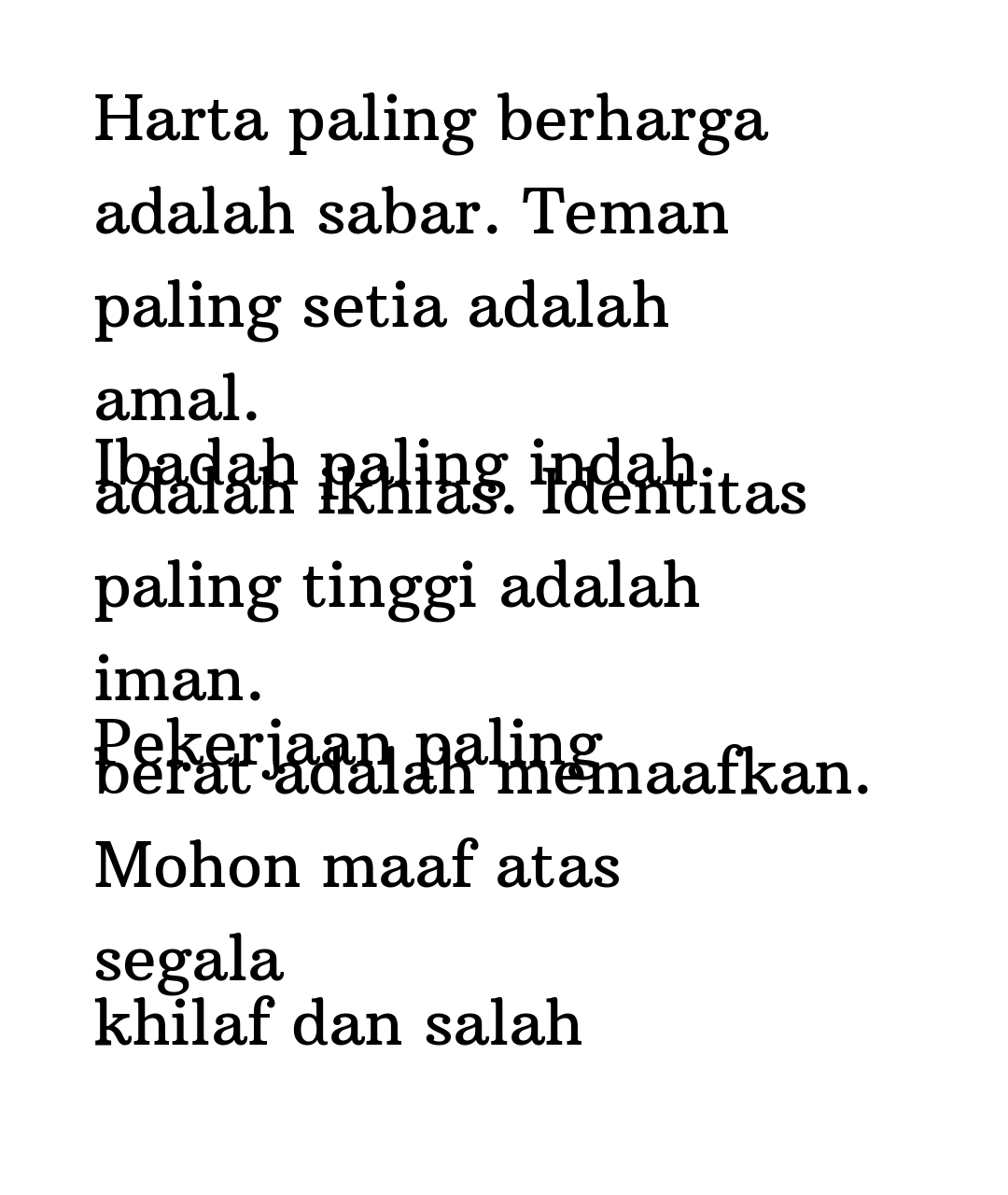 Kata Bijak IslamiHarta paling berharga adalah sabar. Teman paling setia adalah amal. Ibadah paling indah adalah ikhlas. Identitas paling tinggi adalah iman. Pekerjaan paling berat adalah memaafkan. Mohon maaf atas segala khilaf dan salah