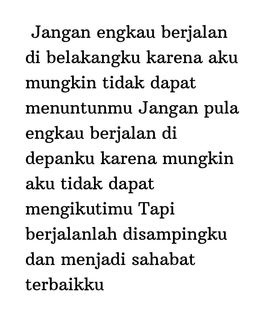 Jangan engkau berjalan di belakangku karena aku mungkin tidak dapat menuntunmu Jangan pula engkau berjalan di depanku karena mungkin aku tidak dapat mengikutimu Tapi berjalanlah disampingku dan menjadi sahabat terbaikku