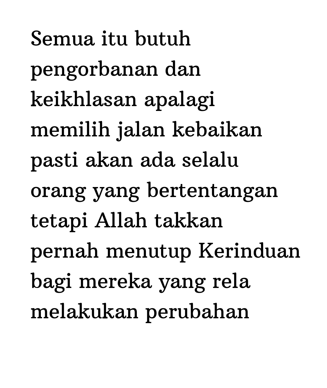 Kata Bijak IslamiSemua itu butuh pengorbanan dan keikhlasan apalagi memilih jalan kebaikan pasti akan ada selalu orang yang bertentangan tetapi Allah takkan pernah menutup Kerinduan bagi mereka yang rela melakukan perubahan