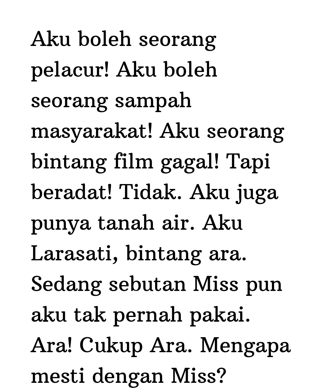 Pramoedya Ananta ToerAku boleh seorang pelacur! Aku boleh seorang sampah masyarakat! Aku seorang bintang film gagal! Tapi beradat! Tidak. Aku juga punya tanah air. Aku Larasati, bintang ara. Sedang sebutan Miss pun aku tak pernah pakai. Ara! Cukup Ara. Mengapa mesti dengan Miss? Sebutan itu akan membuat aku berkulit putih. Apakah sebutan itu tantangan kaum pria, kalau aku milik siapa saja?