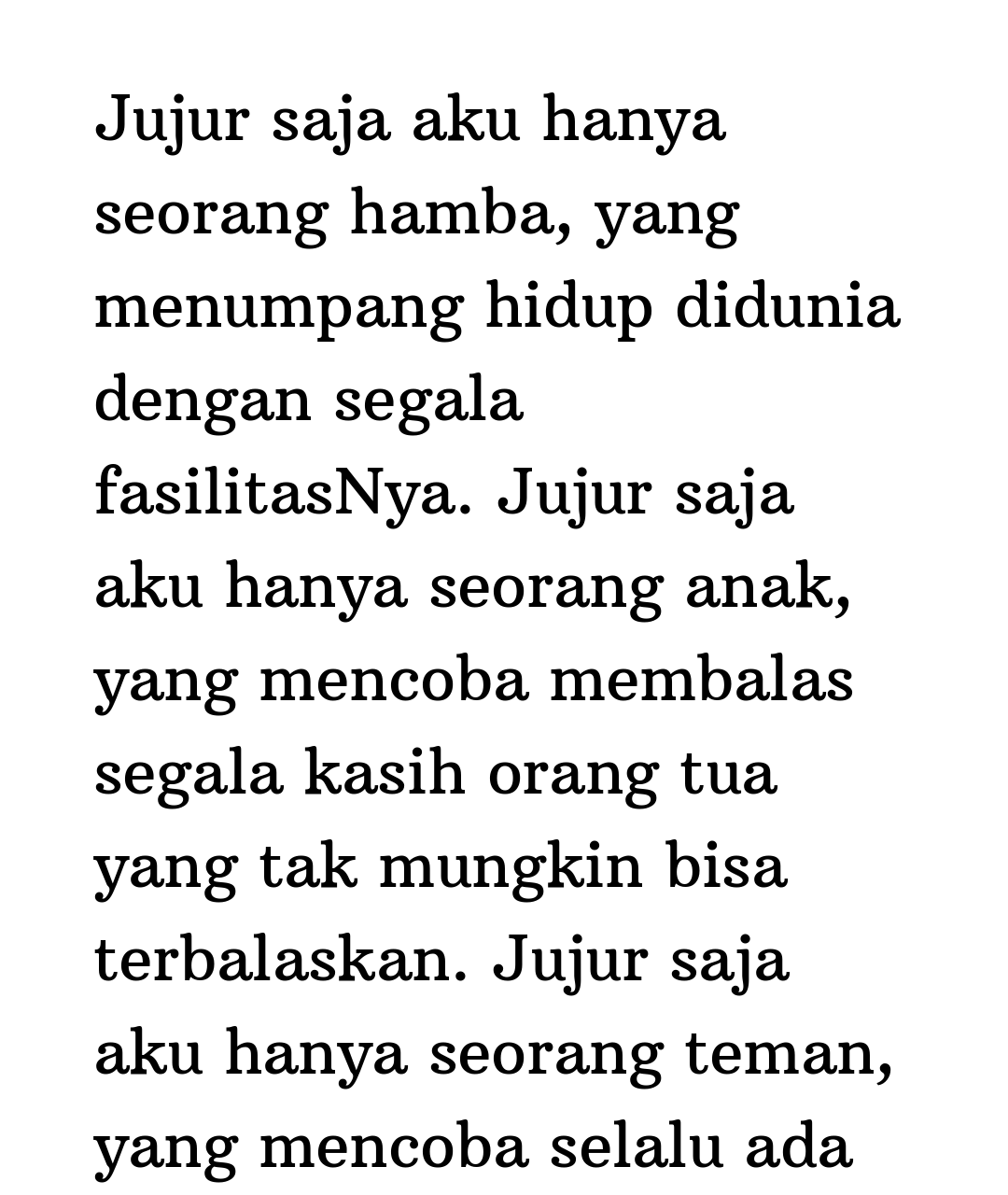 Kata Bijak IslamiJujur saja aku hanya seorang hamba, yang menumpang hidup didunia dengan segala fasilitasNya. Jujur saja aku hanya seorang anak, yang mencoba membalas segala kasih orang tua yang tak mungkin bisa terbalaskan. Jujur saja aku hanya seorang teman, yang mencoba selalu ada untukmu menuju kebaikan walaupun aku sendiripun belum baik untuk itu